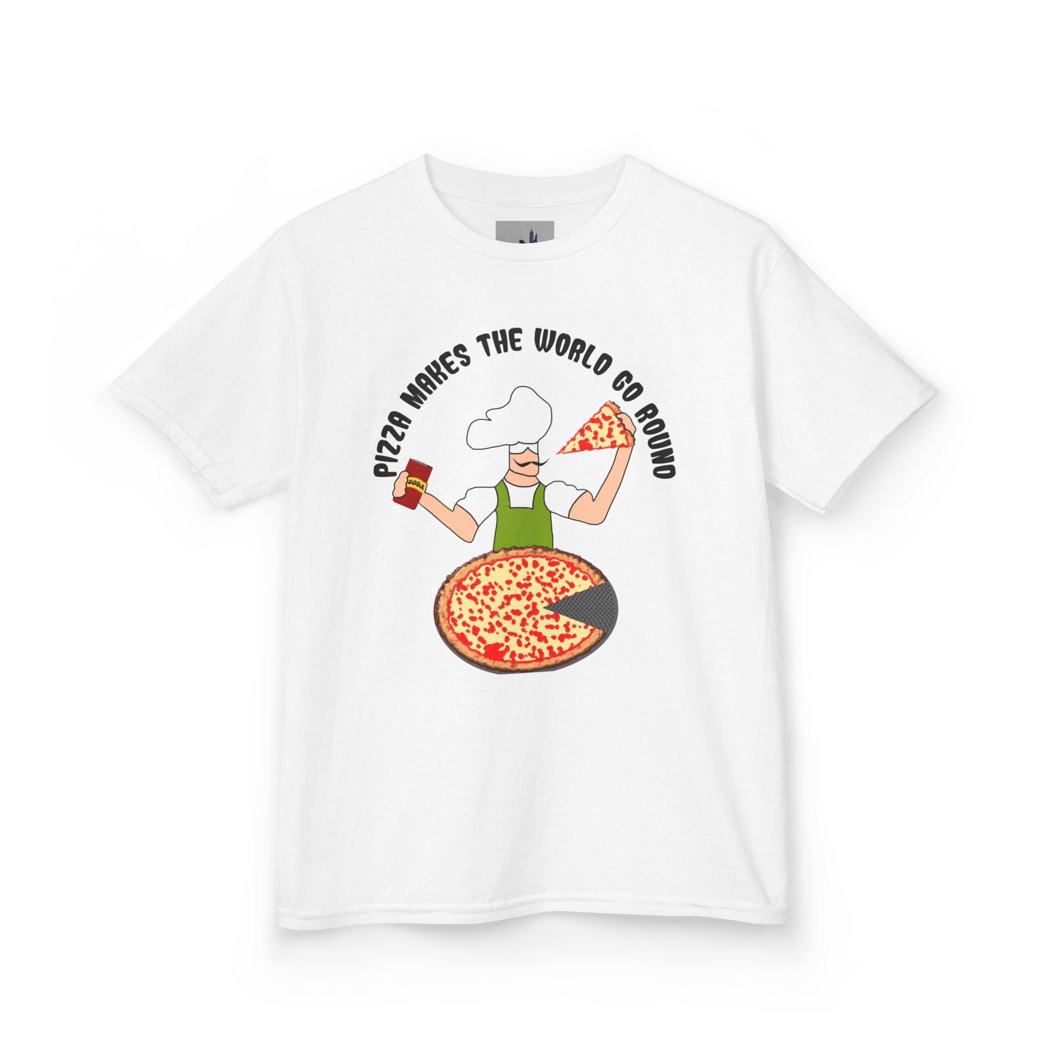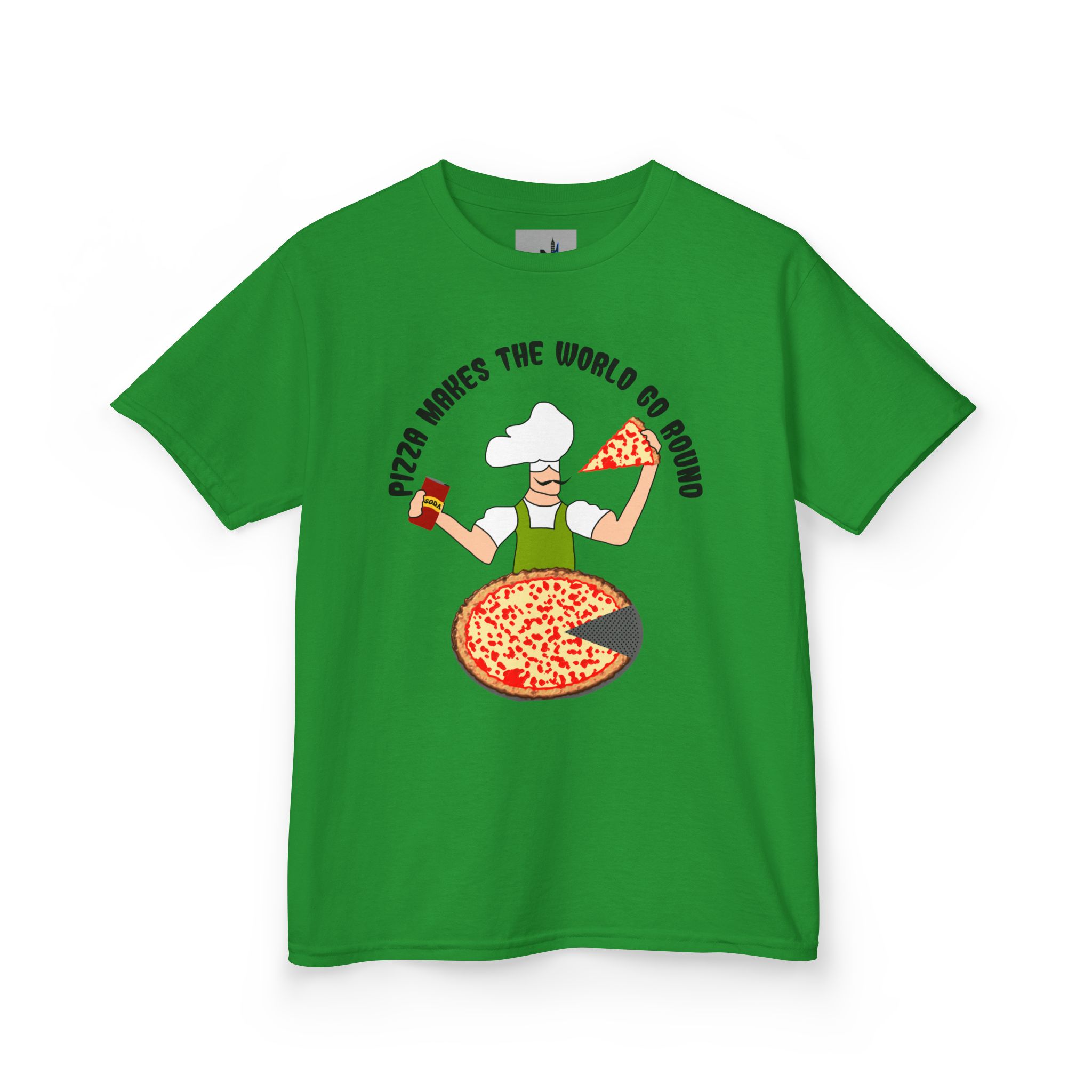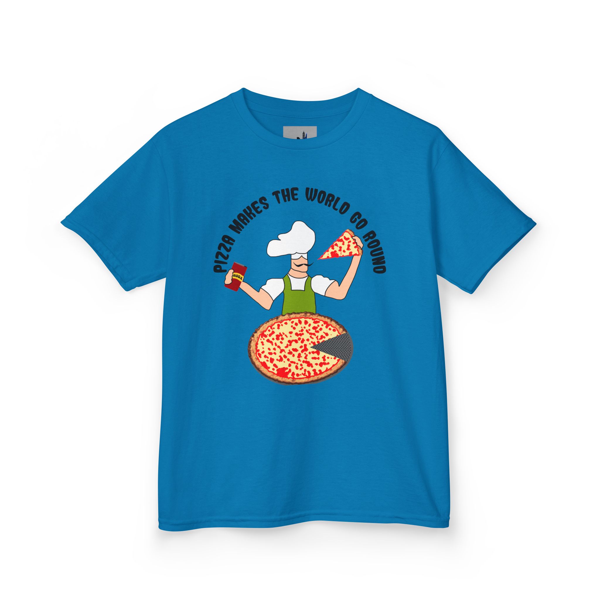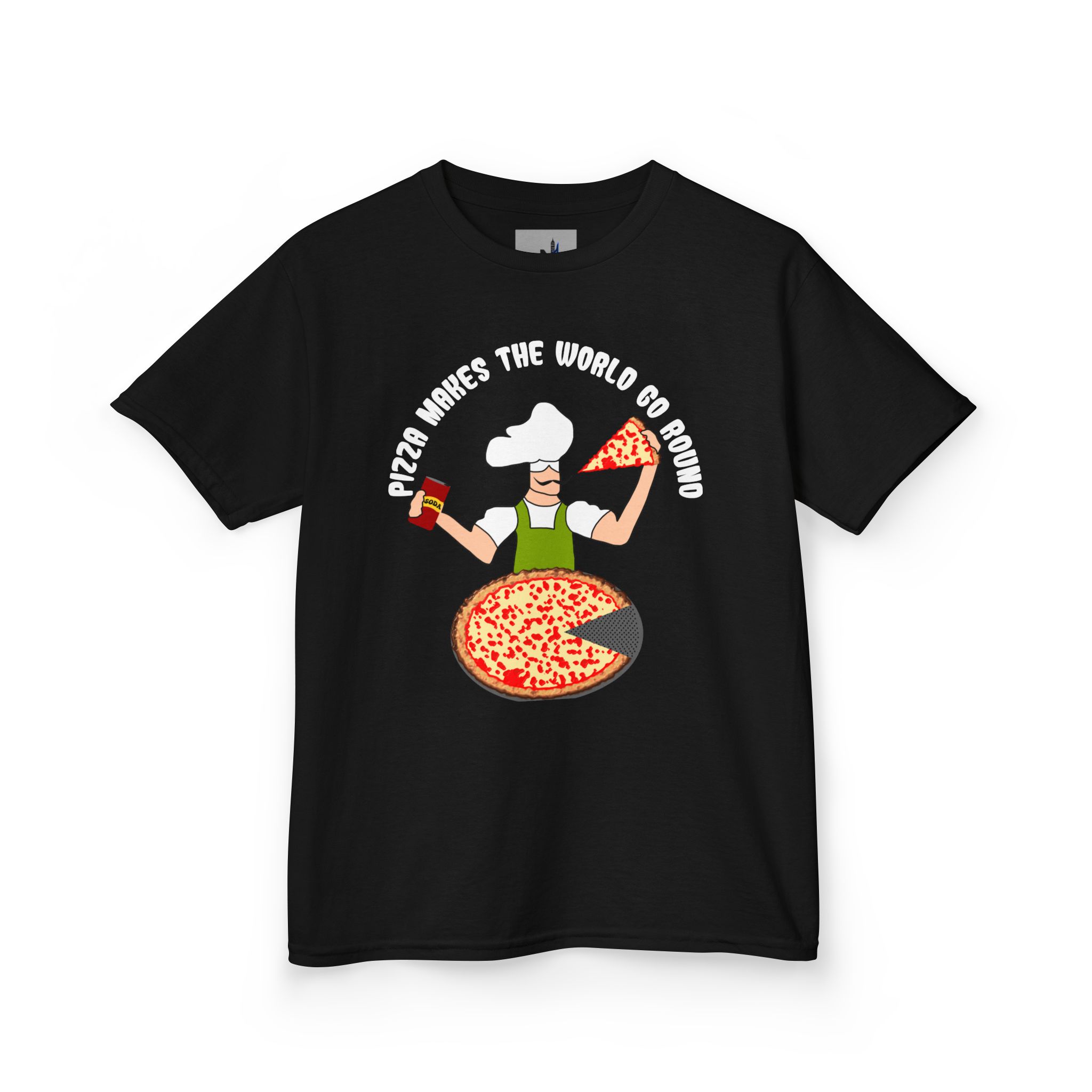 The Foodie Kids Pizza T-Shirt. Every kid knows that Pizza makes the world go round (as is the caption on the t-shirt). Here is a fun way for your youngster to embrace the foodie side of life. Illustration: A hungry Pizza Chef taking a slice from the huge pie he just made.