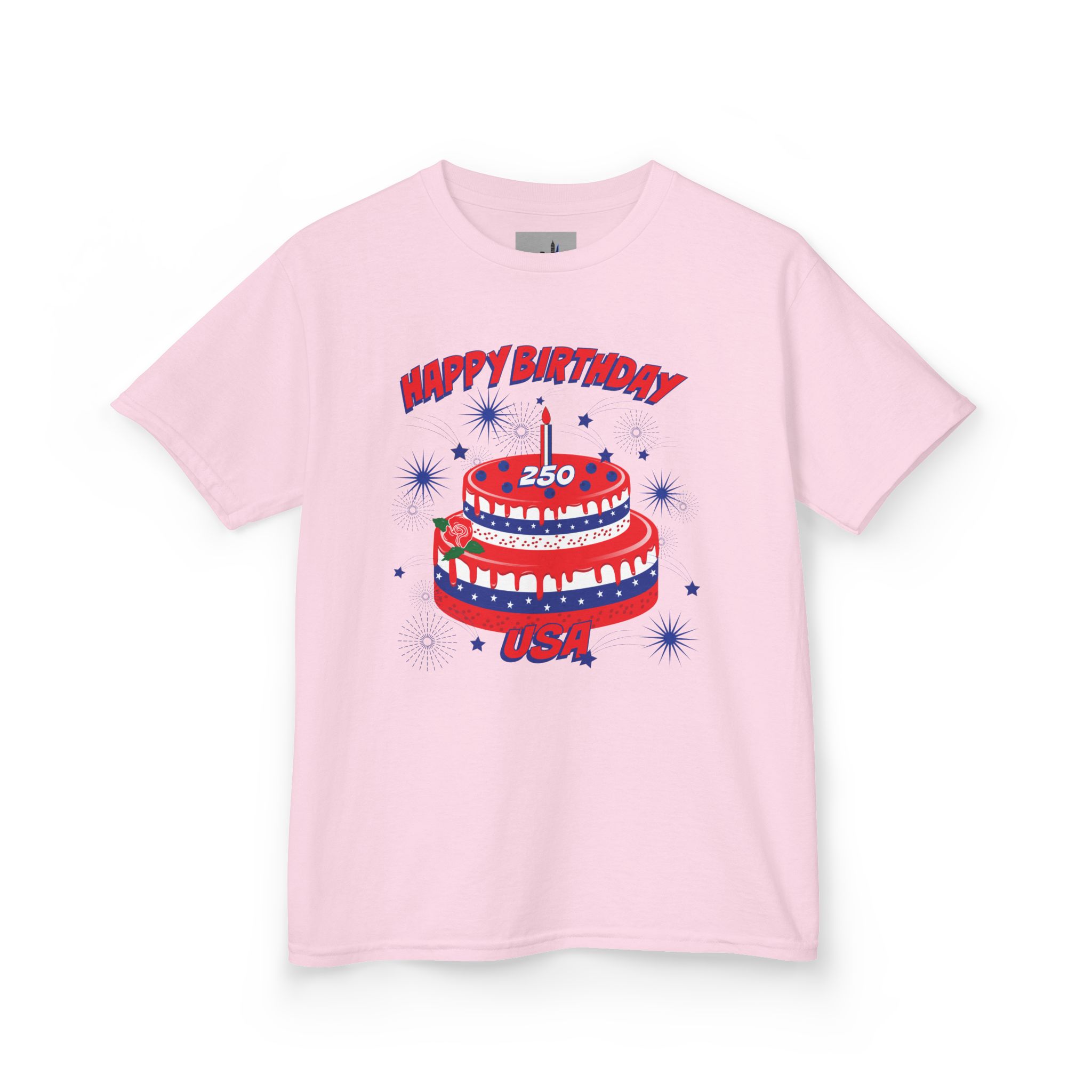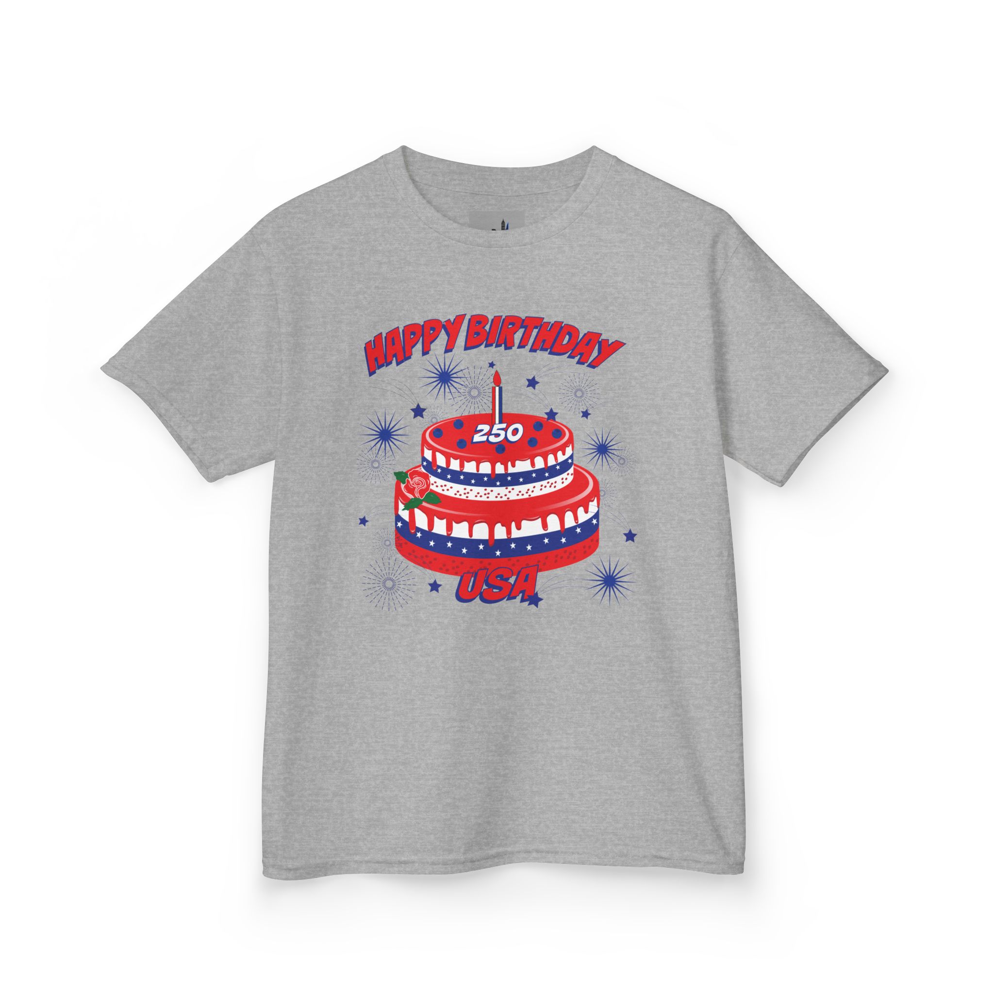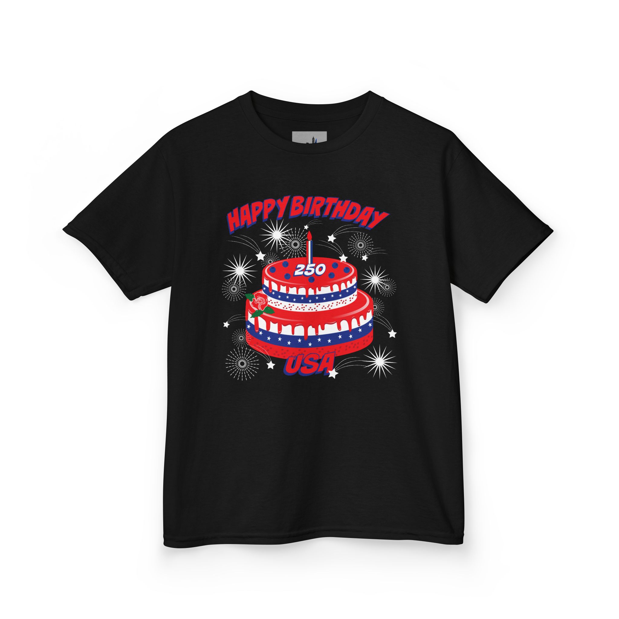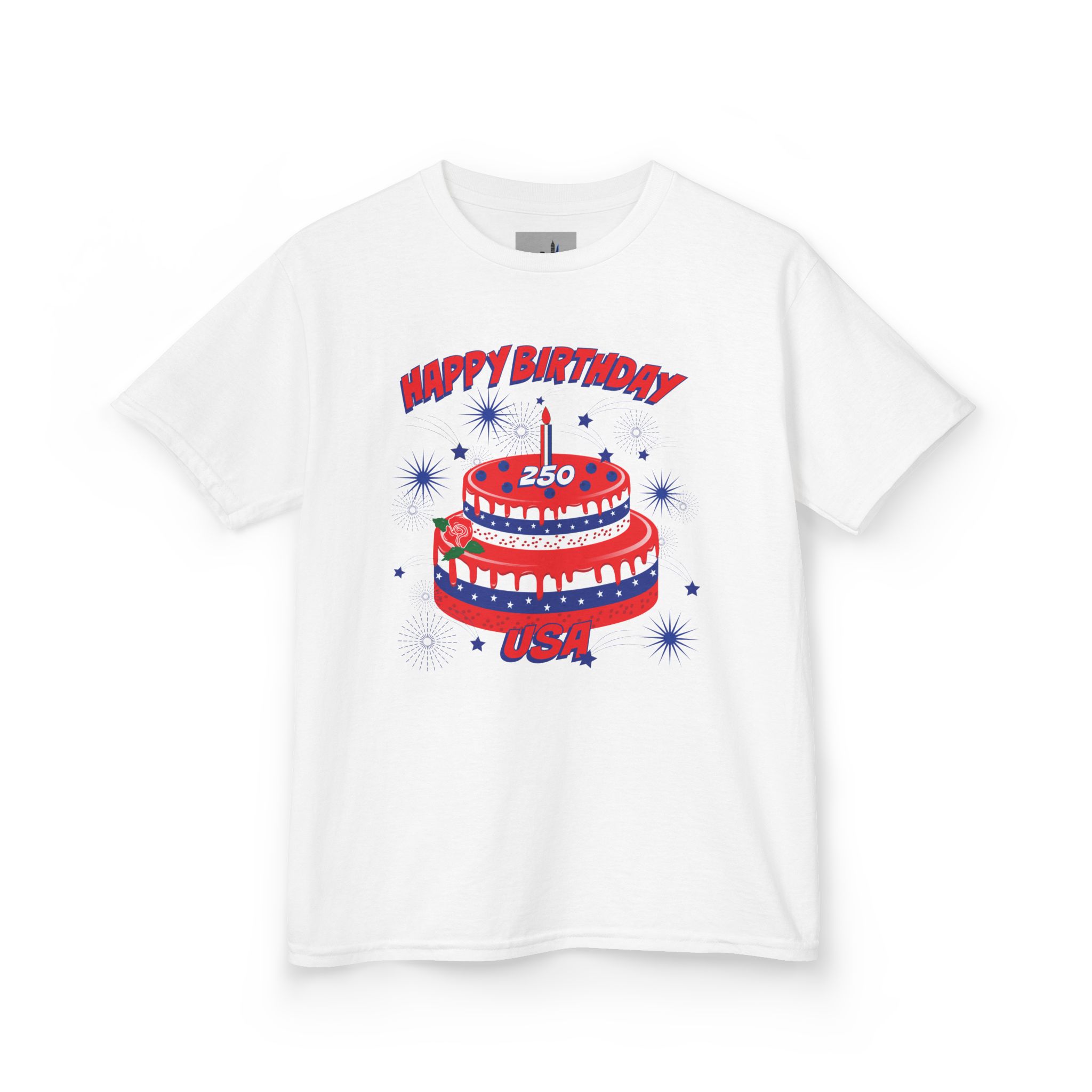 Joyful, all-American “Happy Birthday USA kids t-shirt” celebrating 250 years of freedom and grace from above. Every kid will be excited to wear this anniversary tee this year and it will be a happy reminder in years to come.