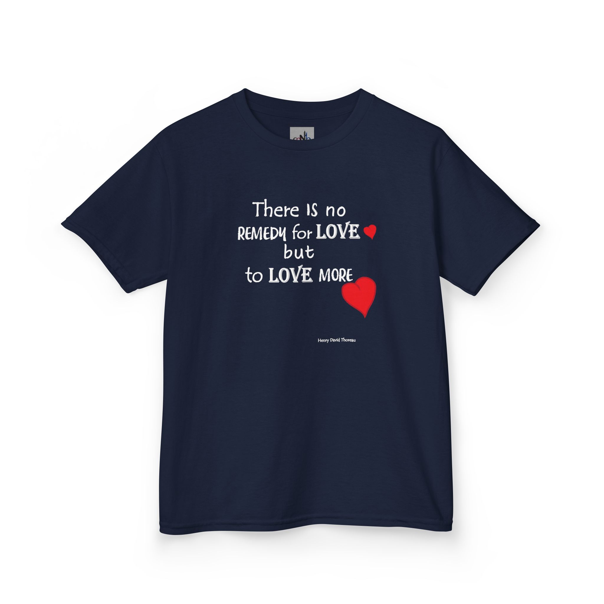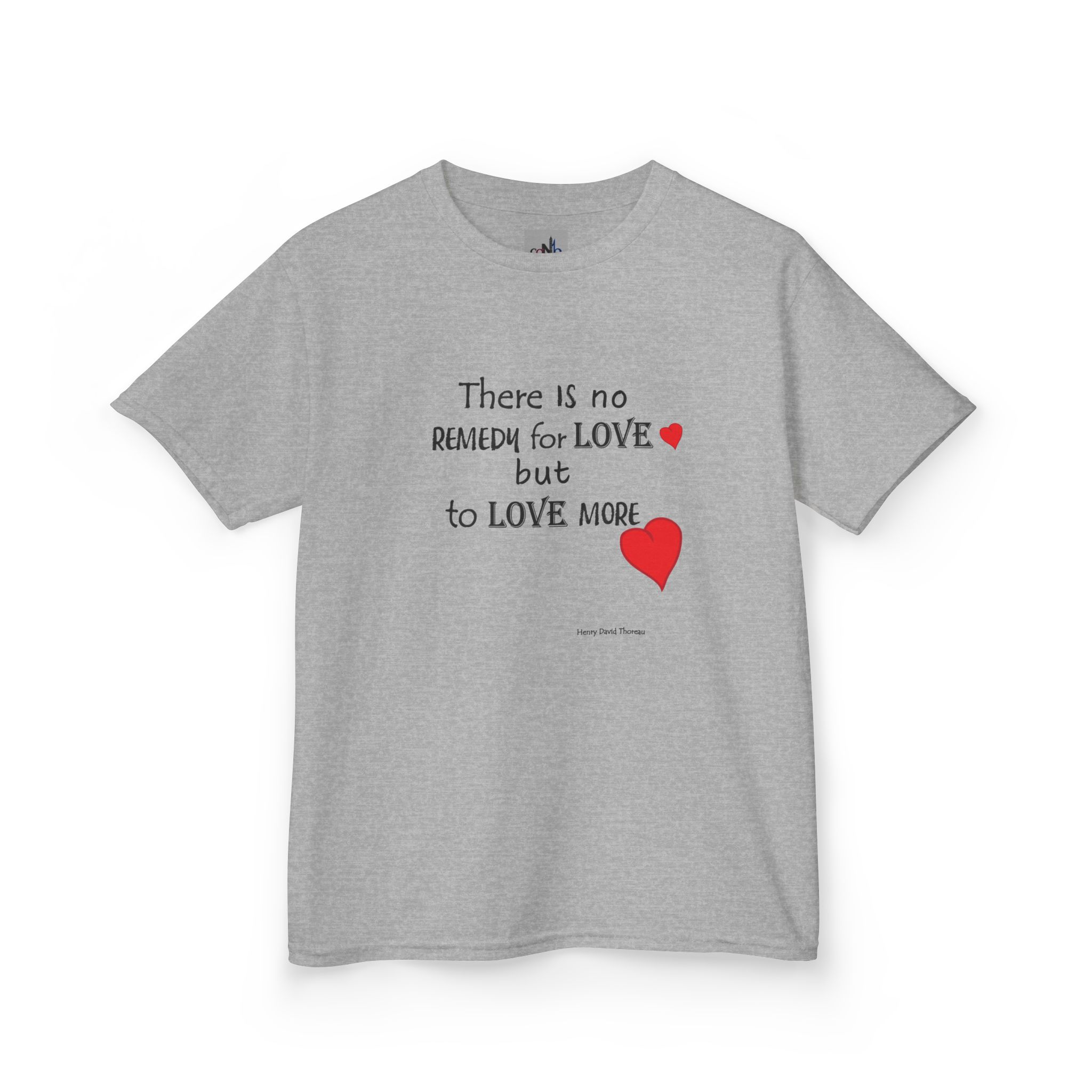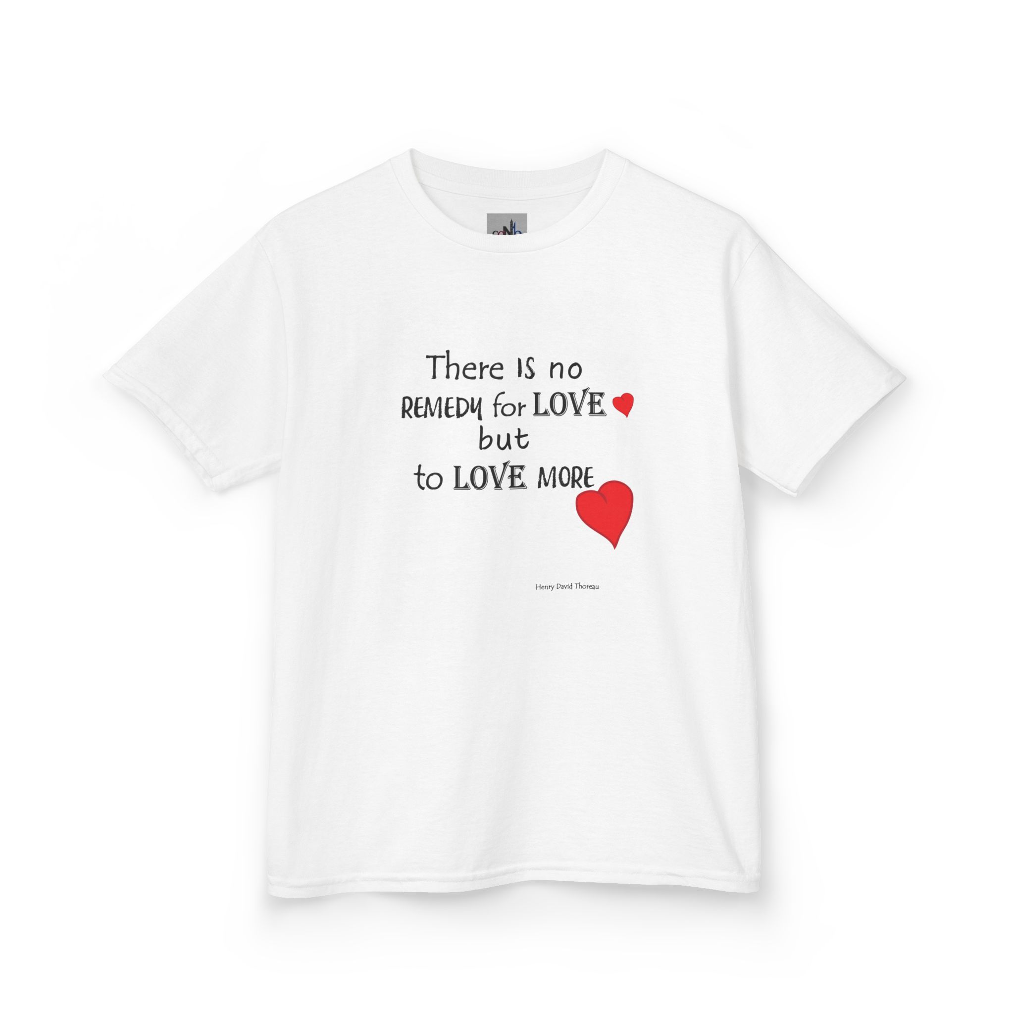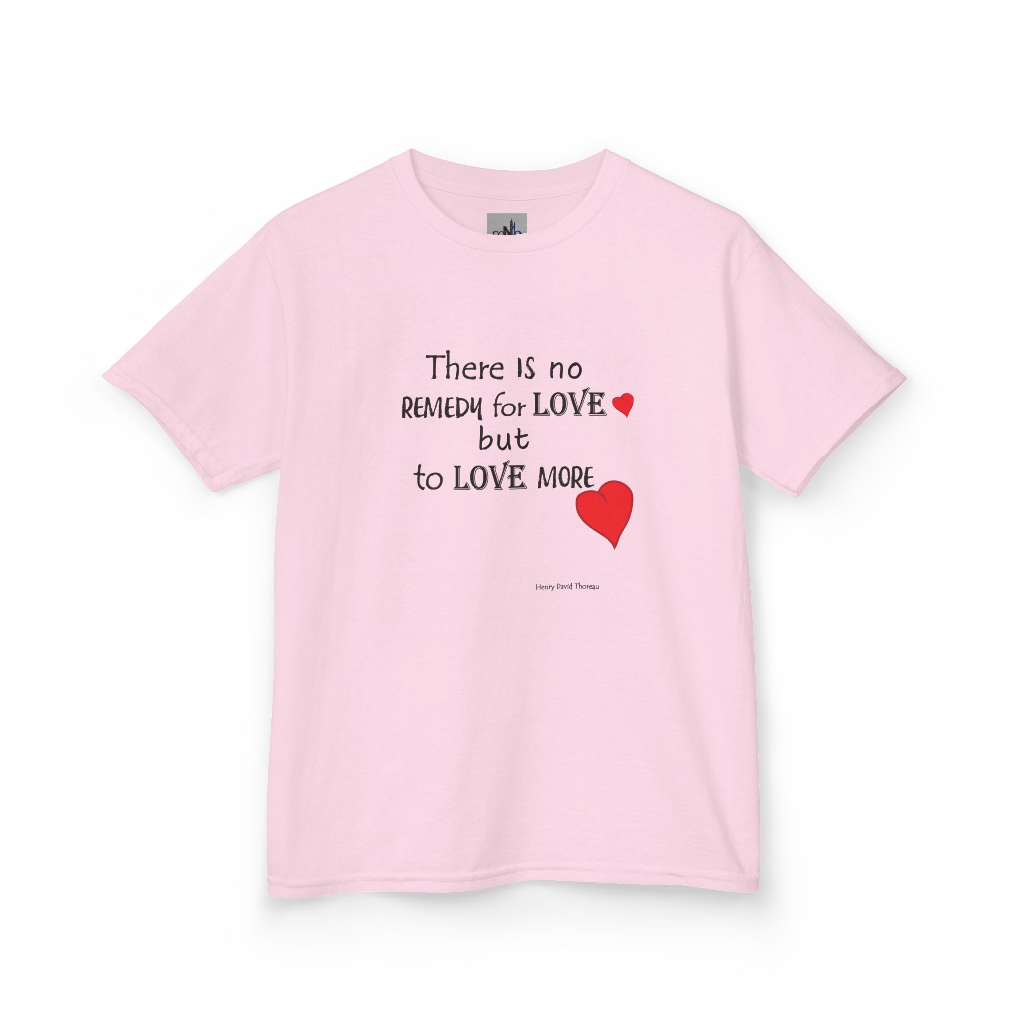 Love Quote Kids T-shirt with red hearts. Let love grow and let it be known. This quote by Thoreau shares the understanding that love has no end.  Suitable for occasions like birthdays or Valentines Day.